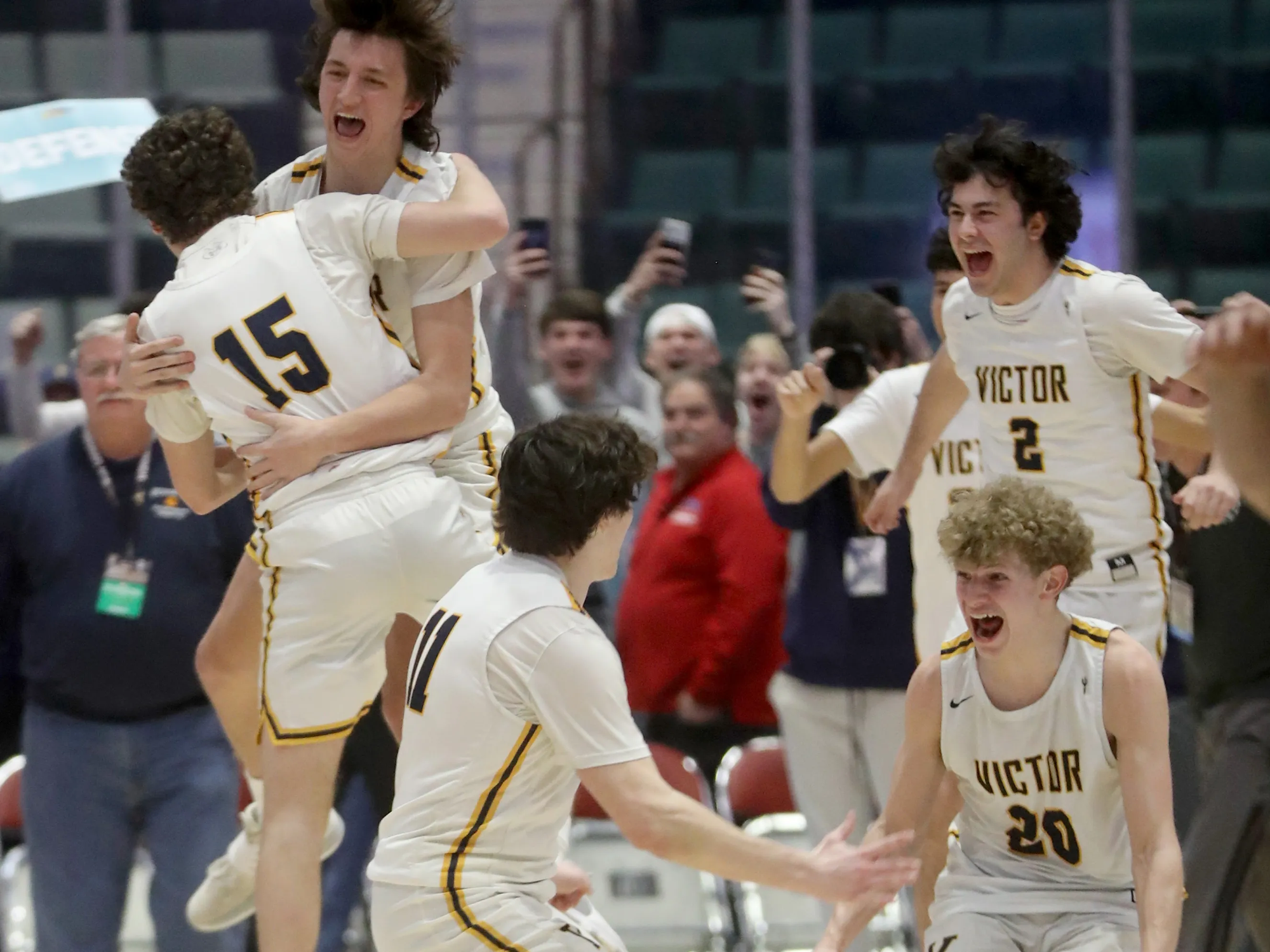 Griffen Hopkins, Cam Ryan, Colin Kubrich, Jack Luchessi, and Garrett Clar celebrate after beating North Rockland 56-38 in the 2023 New York State class AA final.